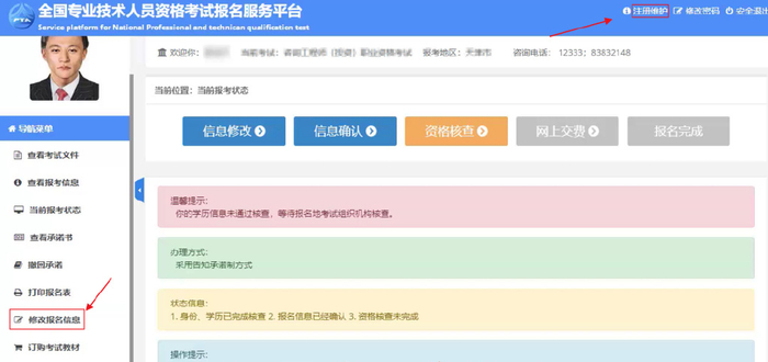 点击>>即可免费下载领取!希望能帮助到正在备考的你们!01、报名信息确认前报考人员在报名信息确认前可以修改报名信息,在报考状态流程图点击“信息维护”进行操作。