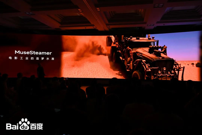 视频生成模型MuseSteamer,亮相 今天的AI DAY上,还亮相了一位新伙伴,先来一起感受一段惊险刺激的沙漠追逐电影片段 : 这段内容的视频画面,大量音效、人物台词,都是由百度商业研发团队自研的视频生成模型“MuseSteamer”完成。