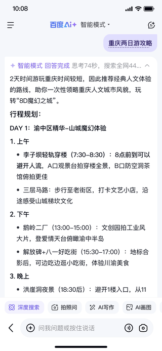 用户可以通过AI汇通财经网手机版登录不了助手可实现自主、快捷调用,满足生活方方面面的需求,发现并分发优质MCP的强大技术能力 以重庆两日游为例,告诉AI助手你的诉求,它能帮你个性化定制攻略,为你一一列举游玩时间、路线、购票攻略、交通住宿等细节。
