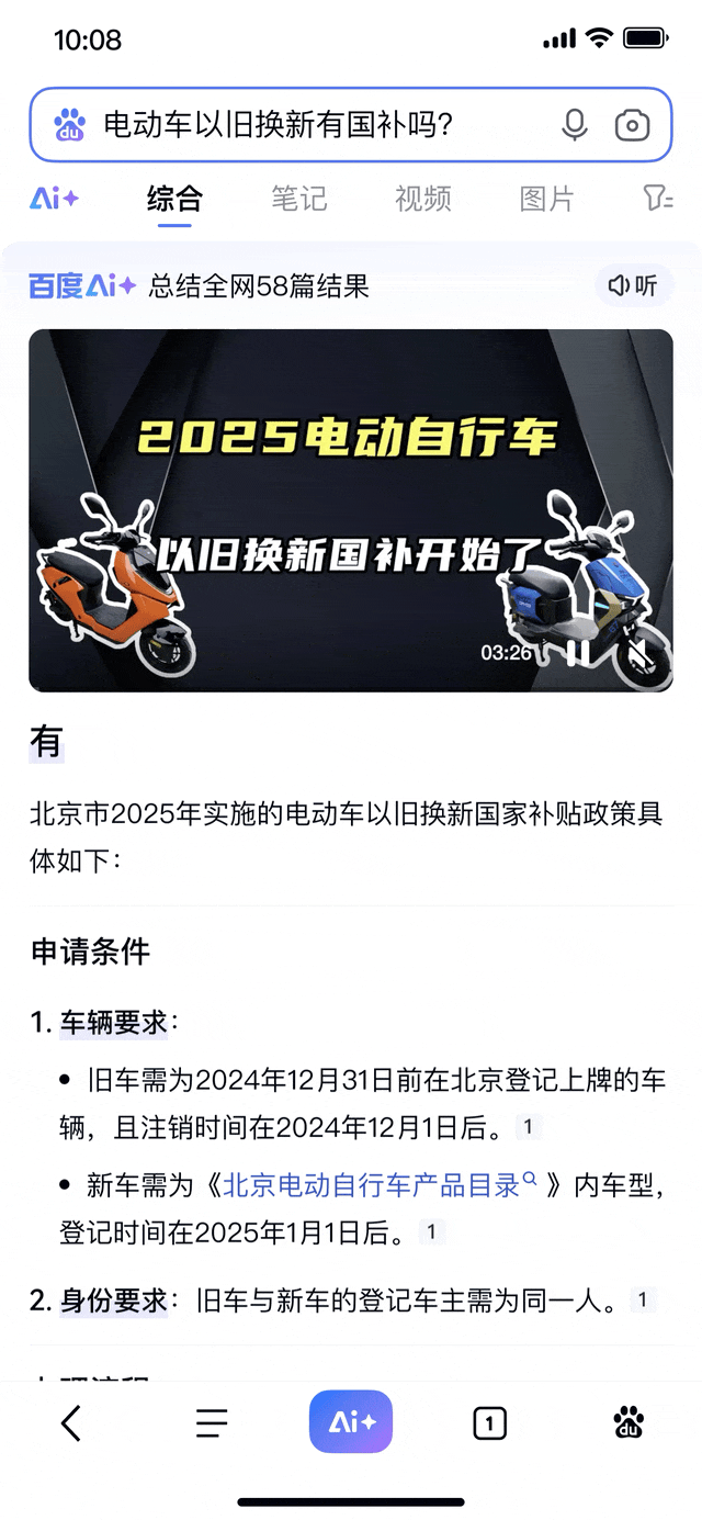 「百看」:给链接 给答案 汇通财经网手机版登录不了 不止是搜索框的变化,搜索的结果页也变得更智能「百看」功能全新升级,不仅支持图文、音视频混合输出结构化内容,还接入智能体、真人服务等能力,把信息以最适配的形态送到你面前 比如,有人问“电动车以旧换新有国补吗?”它会详细回答,并提供领取优惠的小程序入口;如果你有购买意向,商品页、交易链路、服务支持也都已经就位,一句搜索,就是一整套可落地的消费决策路径,整个流程顺滑闭环。