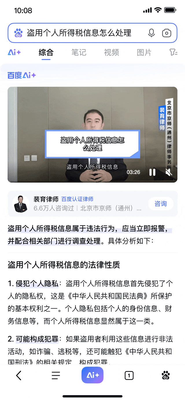 当你问“盗用个人所得税信息怎么处理”时,系统不仅展现专业律师的视频解读,还能智能调用权威小程序和专家智能体,帮你提供解决方案。