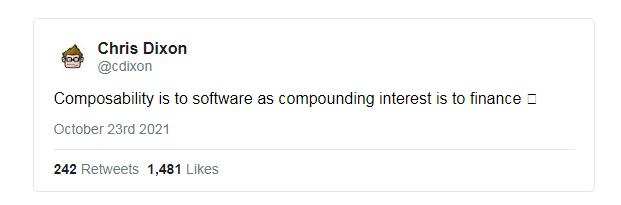 要想去冒险,再也没有比现在更安全的时机了,或者再也找不到这么庞大的对冒险态度友好的社区了工具和技术的快速交流这一条实在是太准了,准到感觉我在作弊web3 的核心组件之一是可组合性,也就是软件模块就像乐高积木一样,开发者可以任意将它们拼凑到一起,从而更快地开发出新产品。