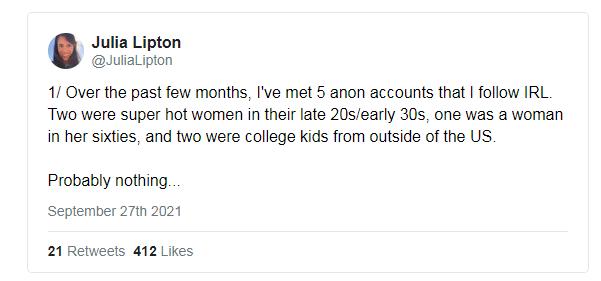 但是假名在 web3 上则无处汇通金财电话不在;这不是什么危险信号,用匿名帐户的形式培养粉丝群发出的也许是这样一个信号,表明你知道自己在做什么这会让竞技场变得公平起来几个月前,我的朋友 Julia Lipton曾在推特上发了一条推文,说的是她跟某些账号背后的真人见面的事:。