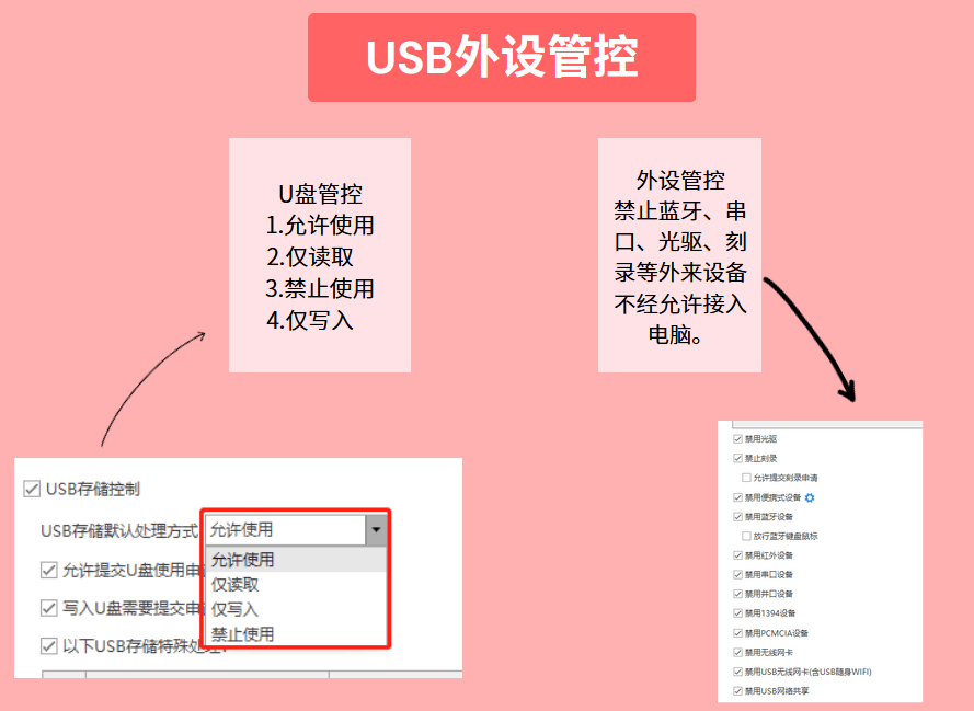 U盘与移动设备管控:可禁止或审批U盘、手机、移动硬盘等设备的使用,限制文件复制操作。即使设备接入,也无法读取或拷贝受保护文件,切断物理介质泄密途径。