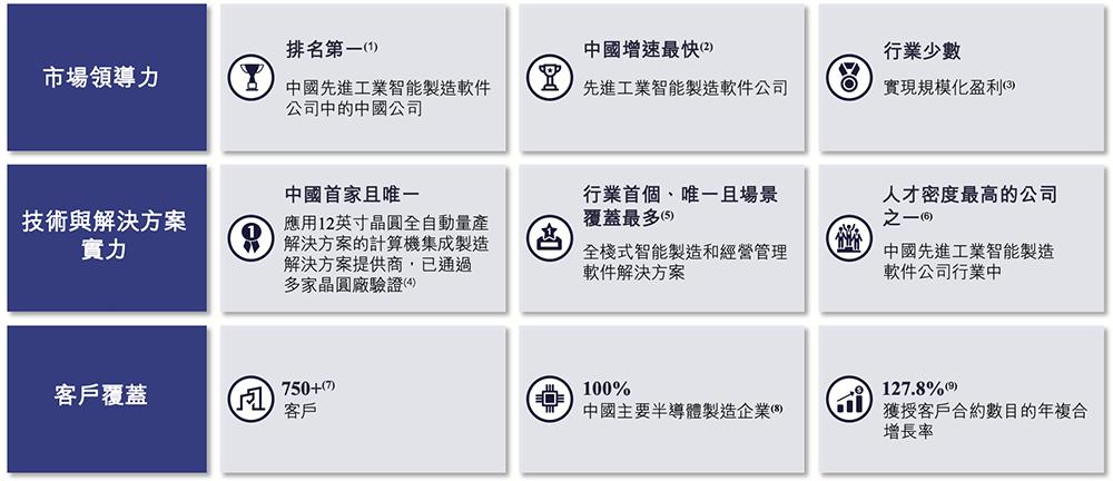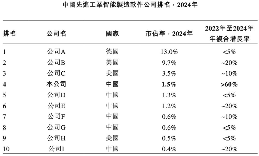 根据灼识咨询的资料,赛美特是少数实现盈利的中国本土先进工业智能制造软件企业之一,按2024年先进工业的工业软件收入计,赛美特是中国先进工业智能制造软件公司市场上最大的中国提供商2024年按先进工业收入计排名前十的中国智能制造软件公司中,按2022年至2024年相关收入的复合年增长率计,赛美特也是。