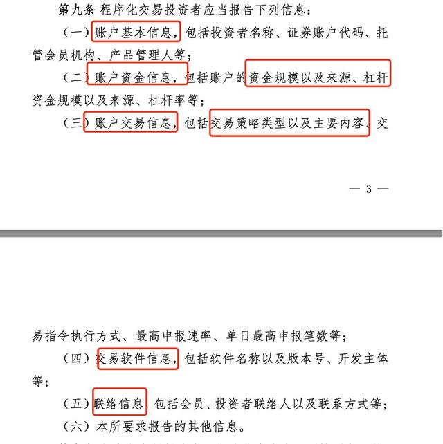四是对穿透报告作出原则性规定程序化交易投资者与客户开展收益互换等业务,并通过自身账户进行程序化交易的,应当按照交易所要求报告其客户有关信息某量化人士向财联社记者表示,早在2023年底,监管已经要求开展股票程序化交易的投资者进行报告工作,券商和量化私募均需上交,相关程序化交易投资者需要提交账户基本信息、账户资金信息、交易信息、交易软件信息以及其他信息。
