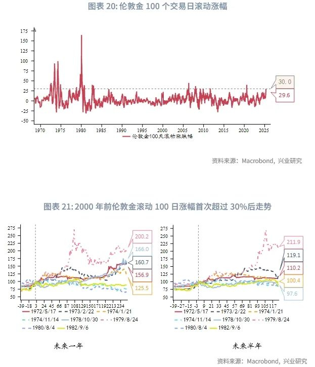 2.3 金价滚动100天涨幅超过30%后走势 截至2025年4月21日,伦敦金滚动100个交易日涨幅达到29.6%,而在4月22日盘中,伦敦金滚动100个交易日涨幅超过30%我们讨论1968年以来,伦敦金滚动100个交易日涨幅首次超过30%后的走势规律。