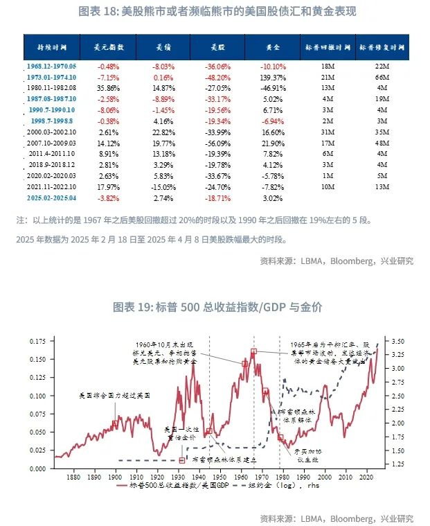 在美国股债汇三杀或者股汇双杀阶段,黄金总体受到追捧从历史走势来看,稳定的货币运行体系往往伴随着股市市值/GDP比值的回升,因为货币信用稳固会降低资本市场的波动性,推动资金流向股票等风险资产,而黄金作为避险工具则会在货币体系较为稳固后因需求减弱表现相对平淡。