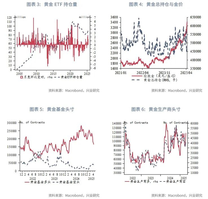 比价方面,2025年4月金银比快速回升,符合我们认为黄金结构性强于白银的判断价差方面,4月境内外价差快速走高 持仓方面,2025年4月黄金ETF净流入117万盎司黄金总持仓量4月快速回落截至4月22日,黄金持仓分化度回落至-1.94。