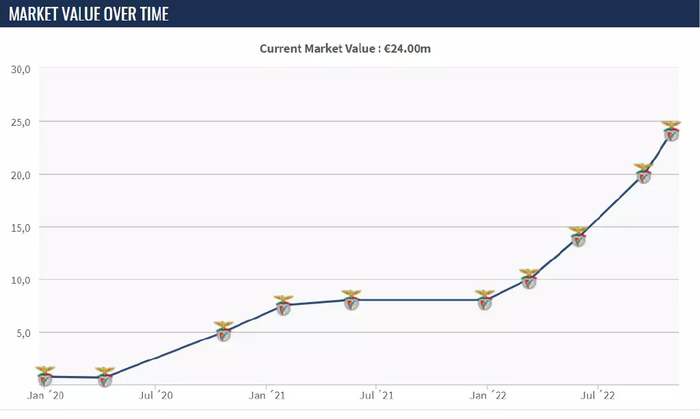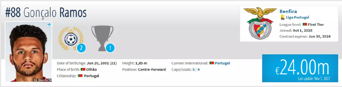 图源GIVEMESPORT今年世界杯中的00后锋线小将贡萨洛·拉莫斯,在对战瑞士的比赛中独中三球,还奉献了1次助攻,帮助葡萄牙队6比1大胜瑞士队凭着持续出色的表现,贡萨洛·拉莫斯的身价较一年前翻了三倍,涨至2400万欧元。