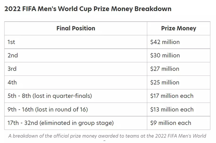 在搞清楚这个问题之前,先来看看世界杯球员们是怎么赚钱的早在开赛之前,国际足联就为本届卡塔尔世界杯设置了4.4亿美元的奖金池只要拿到世界杯参赛资格,每队都能获得900万美元的奖金收入 当然,来参赛的32支球队并不是“混个底薪”就甘心,剩余的奖金如何分配,取决于球队在世界杯上的名次。