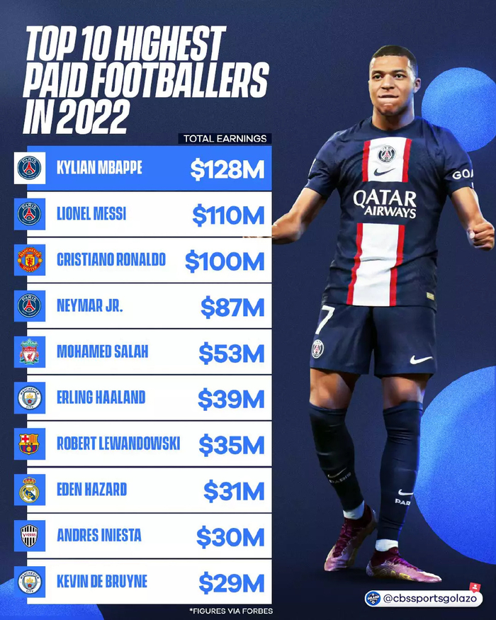 仅仅过去一年,23岁的姆巴佩就凭借1.28亿美元的收入取而代之。这个结果有些出乎意料,去年姆巴佩的总收入还在4000万美元,连前十榜单都上不了。