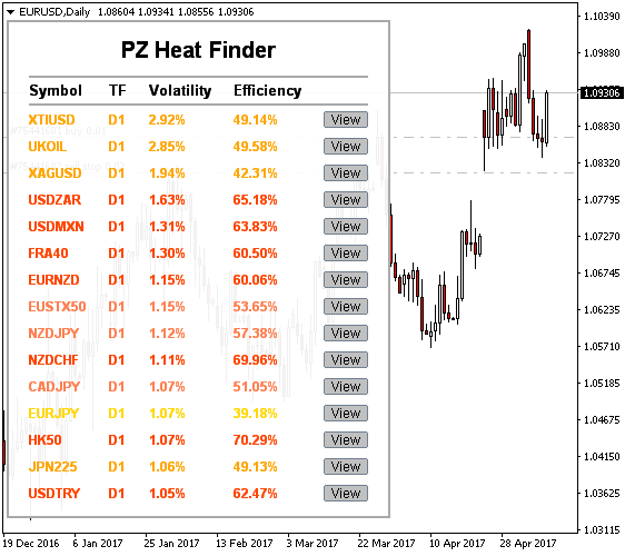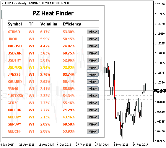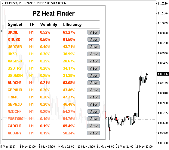 指标仪表板显示最具吸引力的符号,按波动率降序排列。当时最不稳定的符号将显示在顶部。但波动本身就可能具有欺骗性:也许一种工具波动很大但无处可去。这就是效率值也会显示的原因。