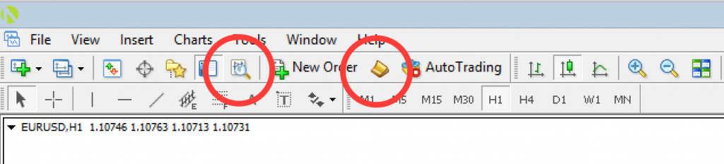 此屏幕截图中的工具栏对您来说应该很熟悉。这些是每个 MetaTrader 应用程序或多或少都应具有的默认控件。如果您没有看到它们,请查看 View – Toolbars以启用正确的工具栏。
