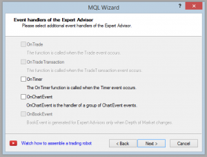 向导中接下来的 2 个屏幕将显示一些与事件相关的选项。事件是智能交易系统执行的时刻,我们将能够通过运行一些自定义代码来“连接”智能交易系统。让我们快速浏览一下我们可以使用的不同类型的事件: