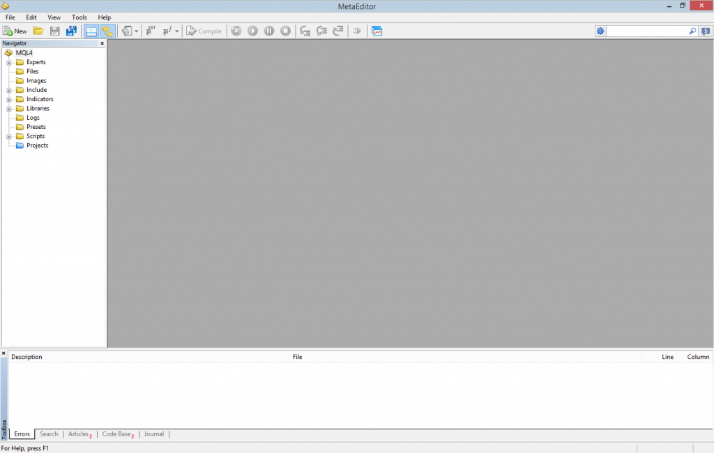 但首先,让我们回到工具栏并单击 MetaQuotes 语言编辑器(右圆圈)。这应该会打开我之前提到的编辑器。将打开一个新窗口,该窗口应如下所示: