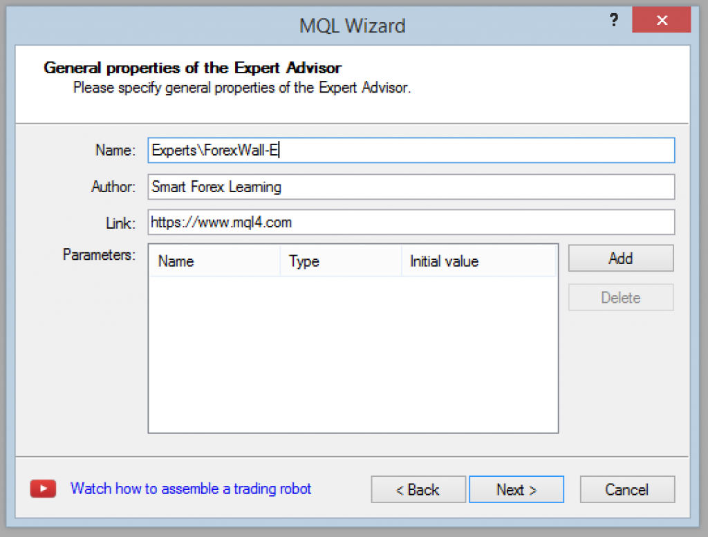 给智能交易系统起一个醒目的名称,例如 ForexWall-E。保持所有其他设置不变,然后单击下一步。