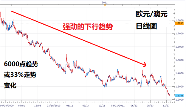 上图是技术面交易者如何注意到这个6000点的趋势例子,在这个趋势中,澳元相对於非常疲软的欧元而言非常强劲(这就是为什么汇价正在下跌)。交易者会通过做空欧元/澳元(卖出欧元同时买入澳元)来进行交易。