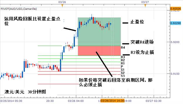 任何交易策略都不应忽视风险管理。当运用枢轴点进行交易时,我们还可以用这些点位来进行风险管理,比如如上图所示,交易者在价格突破R4时买入,那么其止损可以设置在R3下方。如果价格在突破後回落,那么交易者可以在第一时间离场。而在确认好止损位置後,交易者可以通过风险回报比来定位止盈。最根本的是要做到在交易中“输少赢多”。