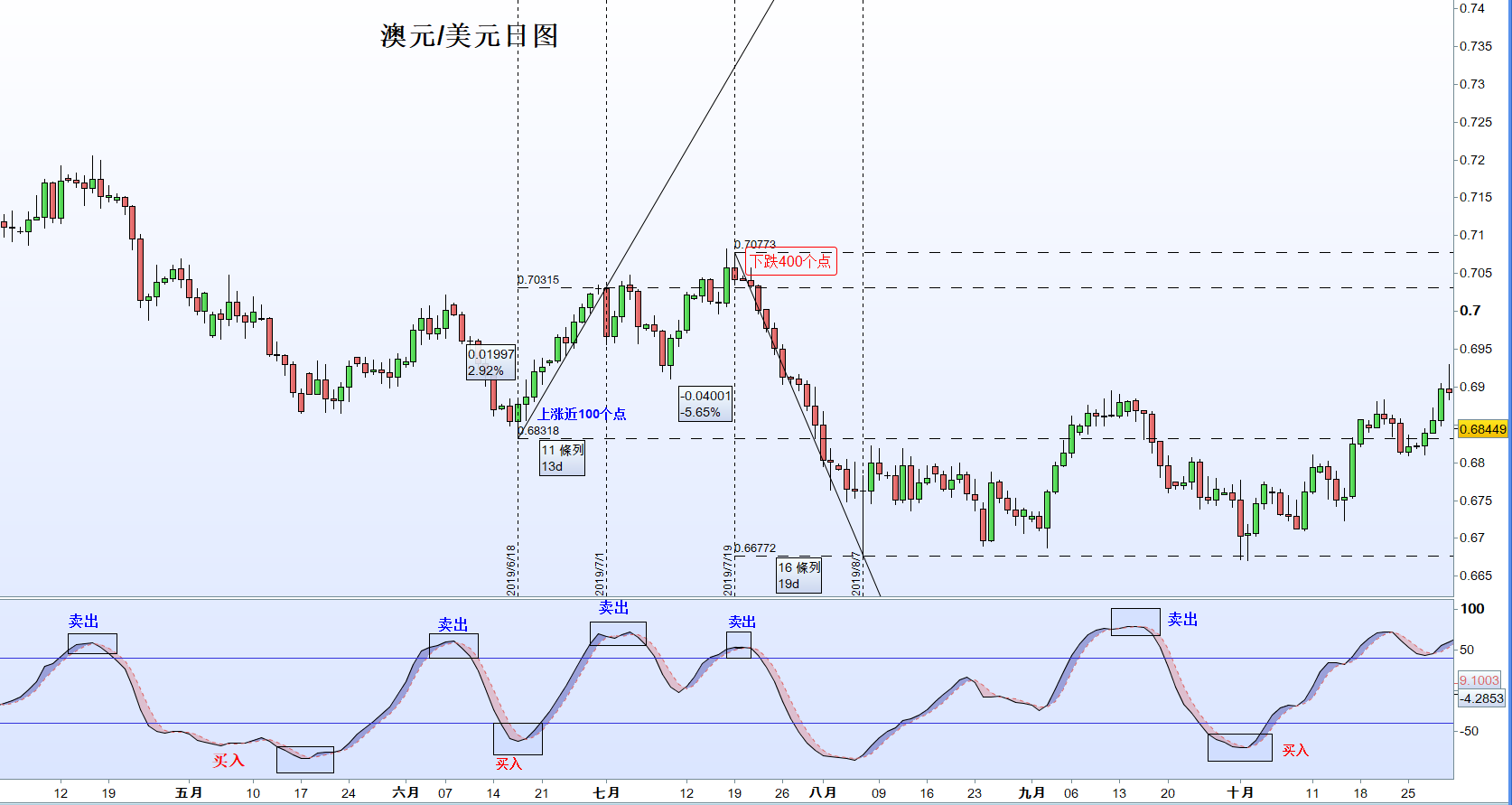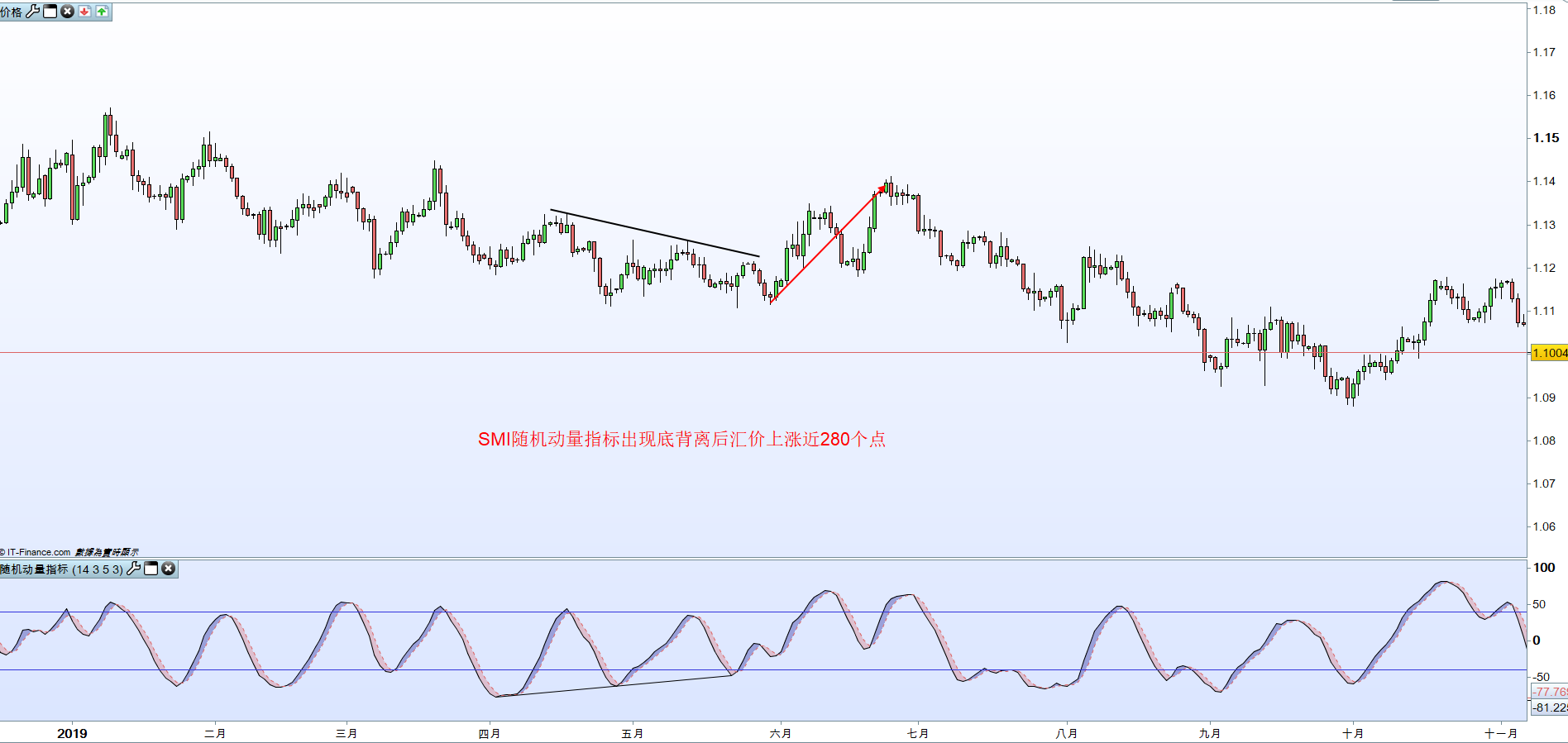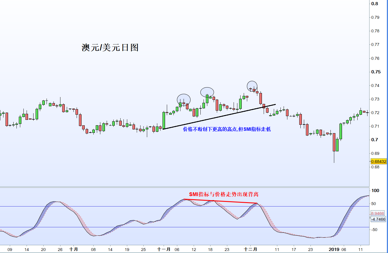以上面澳元/美元日线图未来,今年7月19日,SMI指标在40上方动能指标线下穿信号线,随後汇价大幅下跌400个点。前一个月的6月18日,SMI指标在40下方动能指标线上穿信号线,发出买入信号,随後汇价上涨近100个点。2.SMI指标的背离