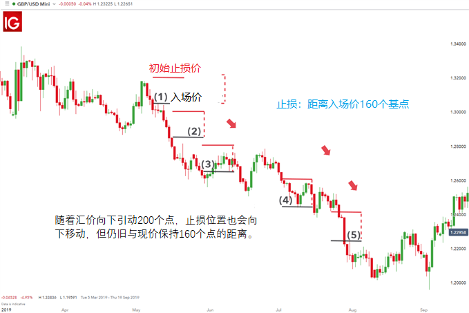 3.跟踪止损:跟踪止损又叫移动止损,即跟随最新价格设置一定点数的止损,之随着汇价仓位有利方向变动而触发。例如,交易者在(1)入场做空欧元/美元,初步止损点为160个点,随着英镑/美元向下引动200个点,止损位置也会向下移动,但仍旧与现价保持160个点的距离。(Richard Snow撰,Cindy译)