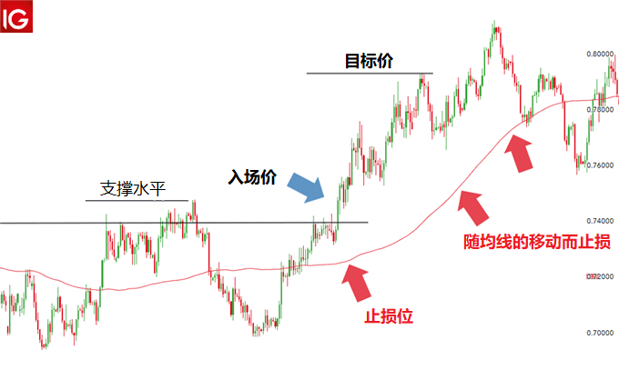 移动平均线:可以在移动平均线的上方/下方设定多头/空头的止损点,下图显示了如何利用移动平均线来进行动态止损。