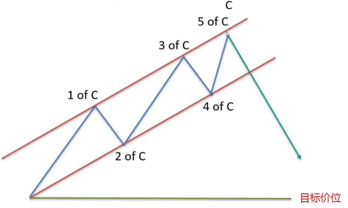 此外,平台型是3-3-5结构,因此C浪具有5个次级浪,而典型的通道画法及目标请参考下图: