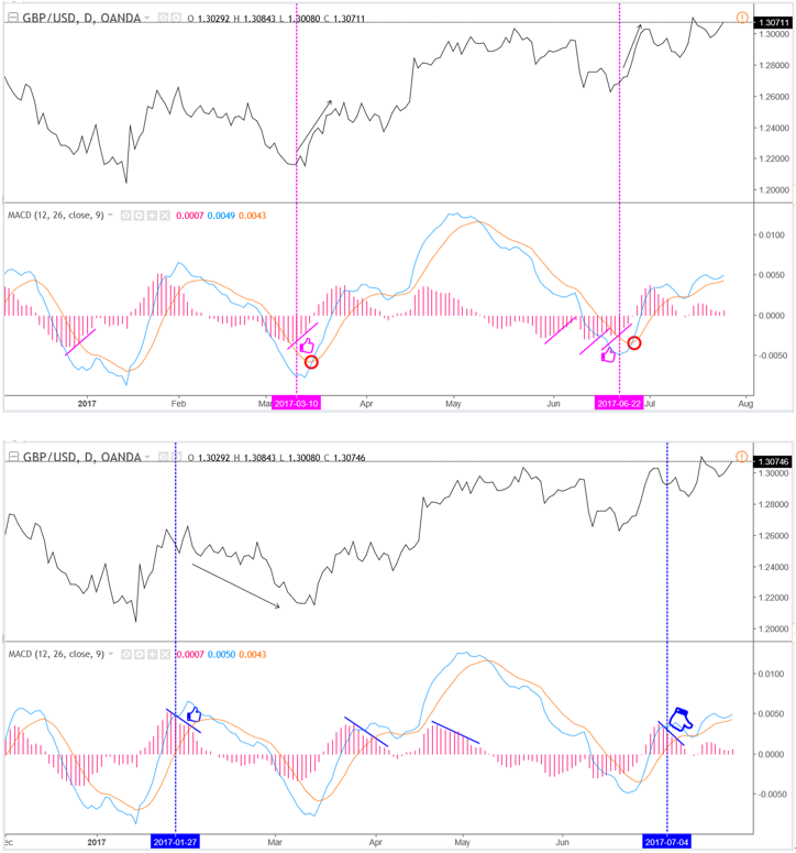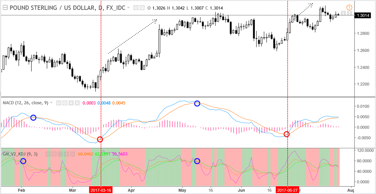 交易者可以利用长周期的MACD指标来判断大盘趋势,然後利用小周期的MACD指标来寻求入场时机及确定建仓价位。