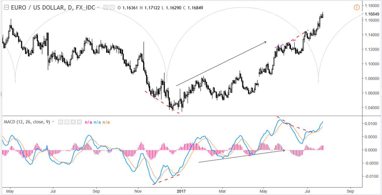接著,MACD值的大小取决於价格的高低,例如:欧元/美元的MACD值在正负0.1之间;美元指数在100上下波动,它的MACD值范围介於-10-10之间;黄金/美元自1800关口回落後,MACD值一度逼近150。 值得留意的是,MACD值并不适用於两个不同价格之间的比较,若要比较不同价格的动能读数,交易者可以考虑使用价格震荡百分比指标(PPO)。