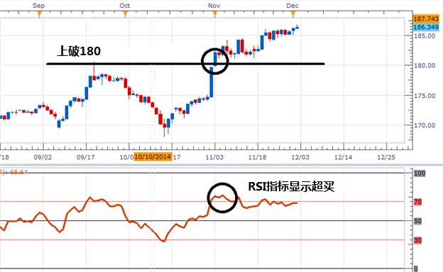 例如:回顾英镑/日元上月的走势。关键阻力位180,11月3日一度上破该点。同时可以看见RSI显示已超买,交易者此刻可以将其作为一个确认看涨趋势的信号,进行买入操作。