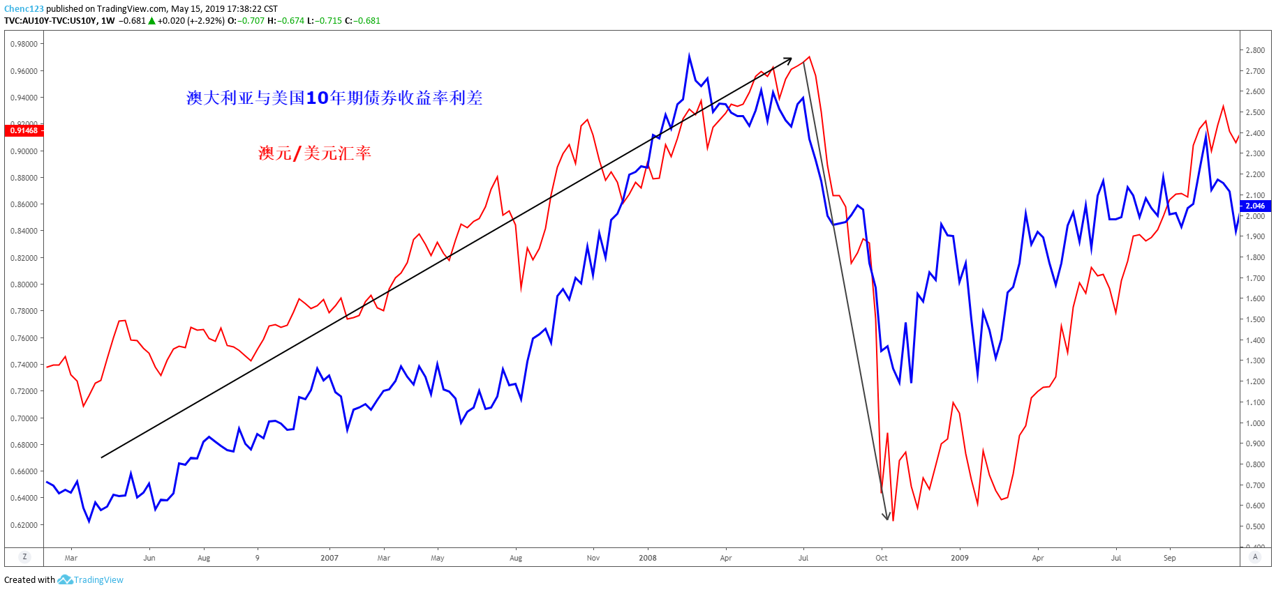 澳大利亚和美国10年期国债收益率的利差最能反应澳元的走势。上图显示,从2006年到2012年,随著澳大利亚与美国10年期债券收益率利差从0.5%上升至2.5%,澳元/美元也在此期间从0.7升至0.9,到2008年金融危机,随著全球主要央行纷纷降息,一旦澳储行也开始降息,澳元的利差优势不再,澳元/美元又从0.9跌回0.70左右。
