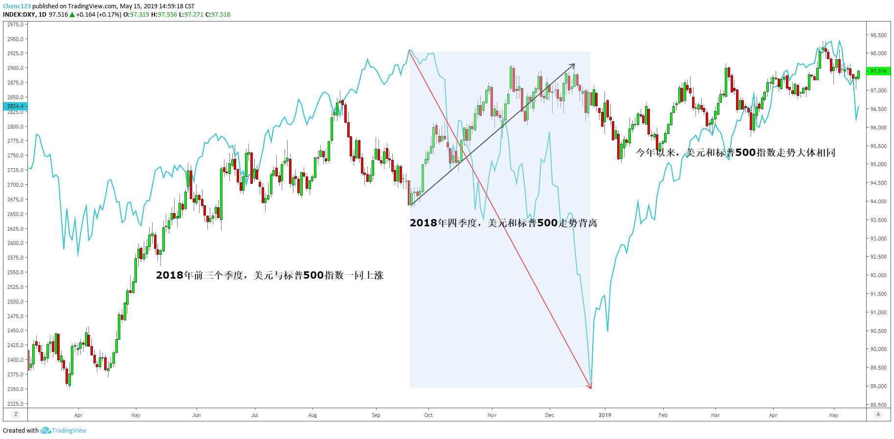 美元VS标普500指数(2018年5月至今)