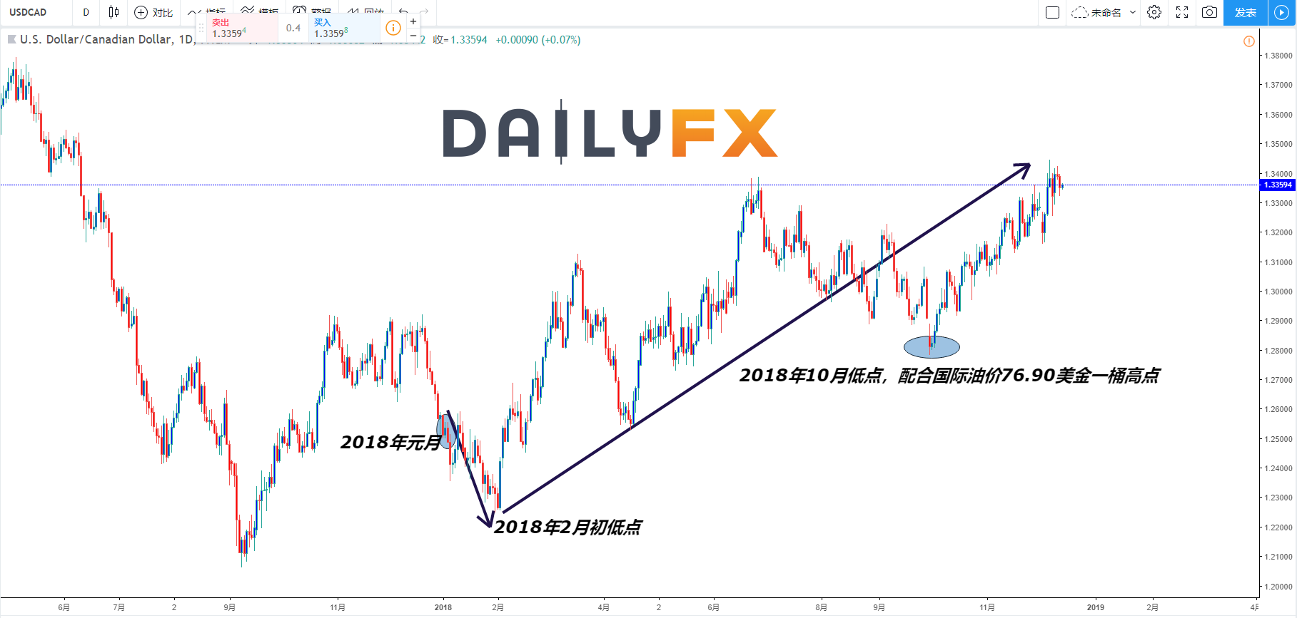 第二是弱势油价,国际油价自2018年10月高点一路下跌,8周时间,跌幅36%。美元加元10月的低点1.2787价格正好对应国际油价10月高点76.80.油价自10月高点下跌,美元加元汇率自10月低点上涨,这意味著加元在贬值中。