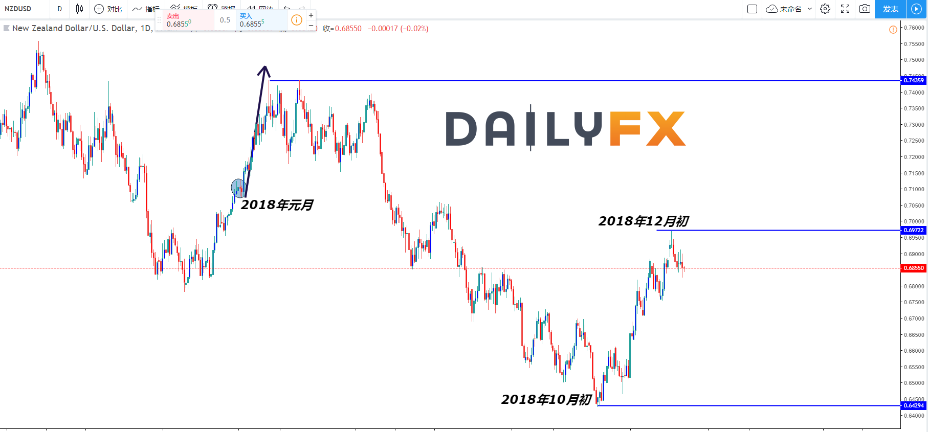 纽元与澳元在2018年的价格走势基本上一个节奏,只是一年来的价格走势中的高低点出现的时间会有几天的误差。