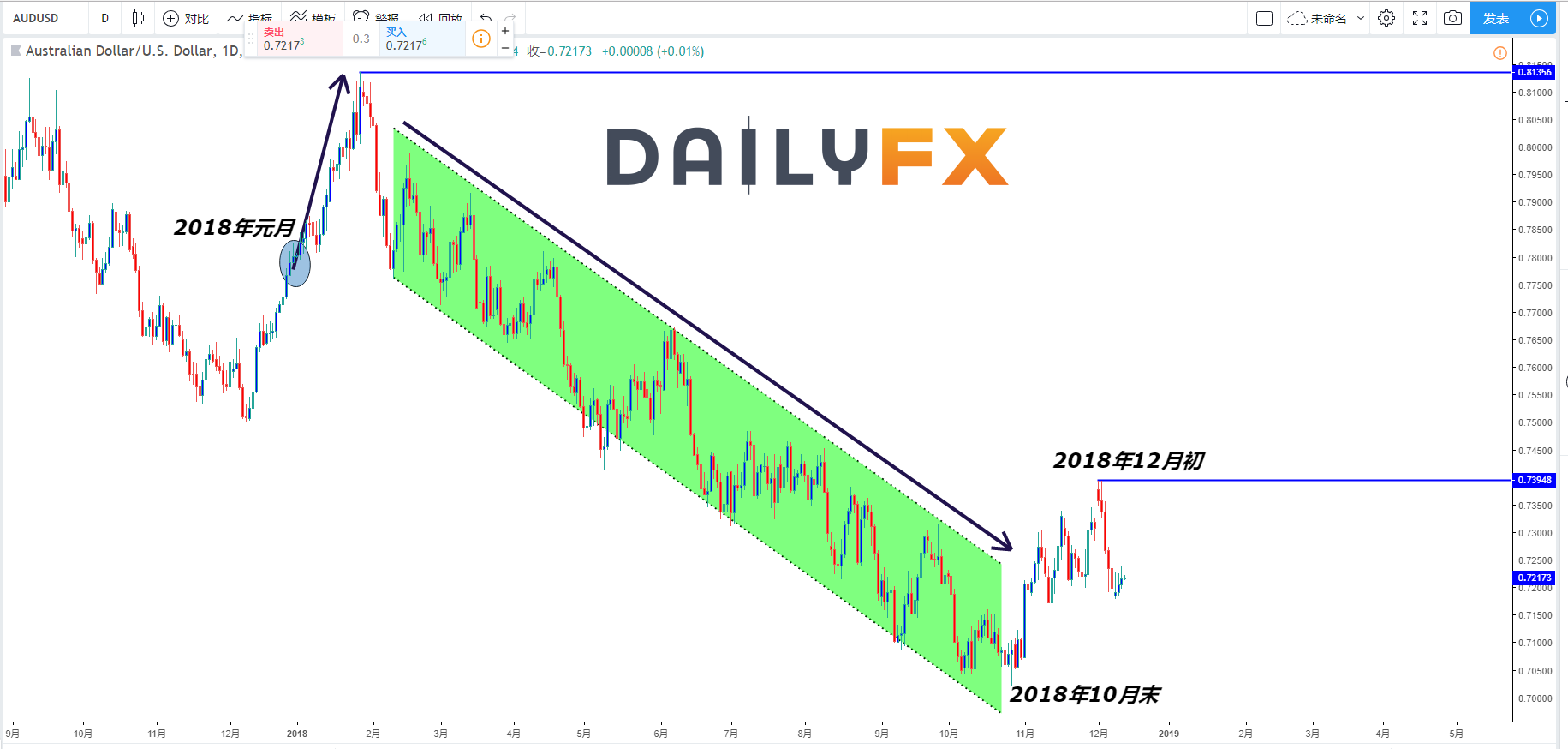 除了2018年年初澳元美元从0.78一线上涨到年内最高点0.8135,其它的时间里基本都是在下跌,自2018年1月高点0.8100一线,下跌了9个月,跌至10月末的0.7020一线。