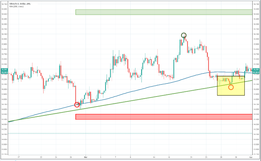首先,请注意白银价格 是如何录得一系列更高的高点和更高的低点的。其次,注意价格如何保持在支撑趋势线之上。最後,注意白银价格是否仍保持在200日均线之上。