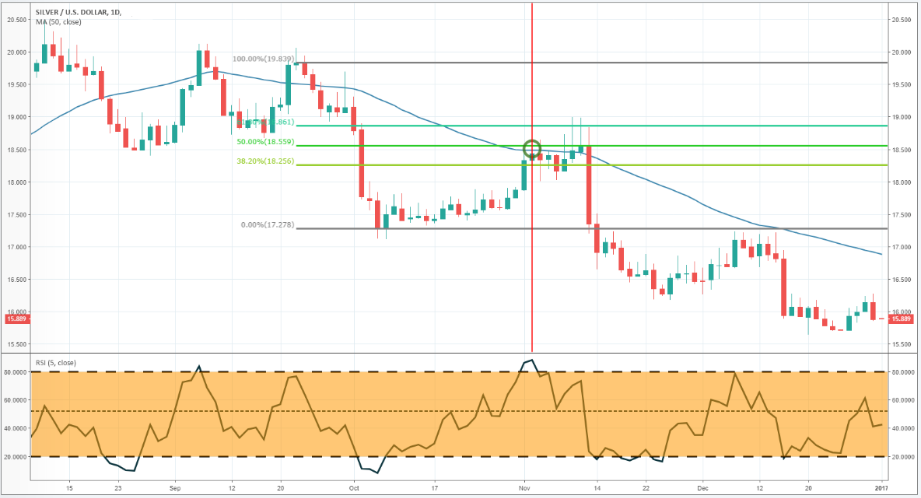 考虑这样一个例子,交易者将如何在下行趋势的白银市场中寻找卖出信号。下图是白银的日线图,显示白银价格一直在50日均线下方,暗示白银处於下行趋势。交易者需要等待指标的汇合,然後他/她再进场。