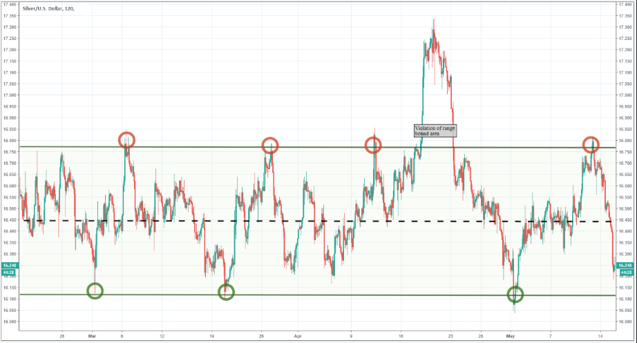 下图表显示了白银价格的盘整。这里有三个步骤,交易者可以用在白银市场的区间进行交易。