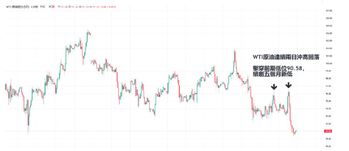 反正在石油输出国组织克制增产后,WTI原油一度反弹3%至日内高点96.55美元。令人意外的是,WTI原油在短暂反弹后立即转入跌势,收盘下跌3.17%,至90.41美元的盘中低点,创下自2022年2月25日以来逾5个月的新低。