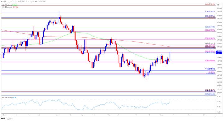 散户投资者情绪的变化可能与澳元/美元的广泛复苏一致,在很大程度上复制了今年早些时候的行为。澳元/美元在8月份站上开盘区间后,预计将自6月份以来首次测试其200日均线(目前位于0.7152)。