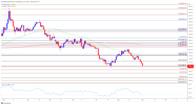 由于金价继续录得本周早些时候以来的一系列较低高点和低点,金价距离测试年内低点(1681)仅一步之遥,随着金价进一步下跌,相对强弱指数(RSI)可能会呈现出与7月份类似的走势。