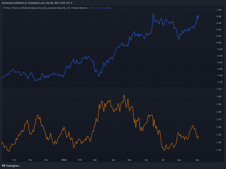 黄金价格(XAU/美元)在8月底大规模抛售后,最近几天开始显示出初步的稳定迹象。然而,在利率上升和美元在外汇领域广泛走强的背景下,黄金价格仍然有些脆弱。自上月中旬以来,美元指数DXY已上涨约3.5%,达到2002年以来的最高水平。在这一特殊时期,实际收益率(借贷成本的实际衡量指标)也大幅飙升,10年期TIPS飙升逾50个基点,至0.86%,与6月份创下的多年高点持平。
