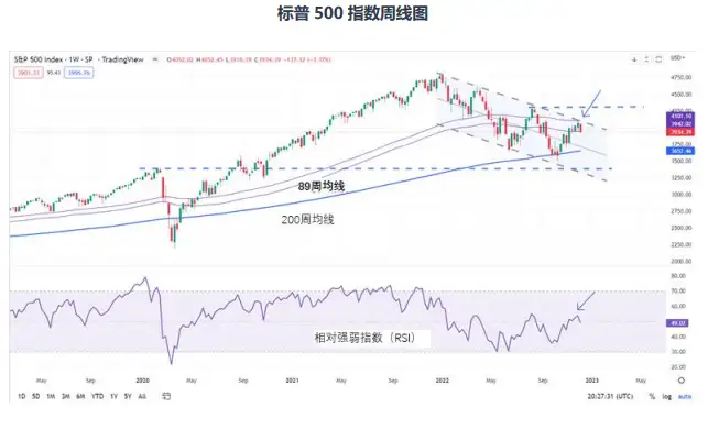 此外,标普 500 指数并未涨破任何重大阻力水平。此处所说的重大阻力水平乃指:从 2022 年初开始 的下降通道上轨,89 周均线以及 8 月份高点 4325 交汇形成的一个关键阻力位。指数需要涨破该阻力 才能降低中期下跌趋势的风险。