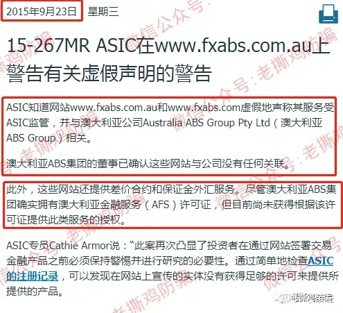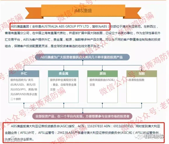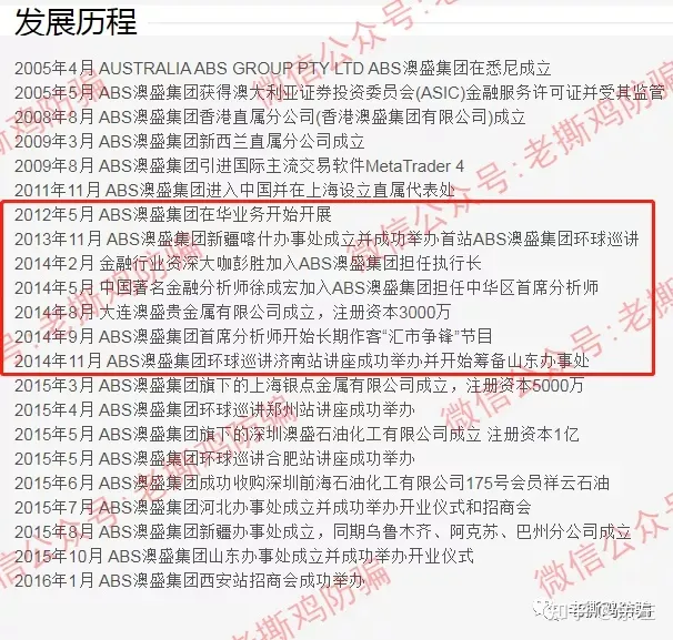 根据ABS澳盛自己说的发展历程,其早在2012年开始就在中国开展业务了,而且还有知情者的佐证!!而ASIC公告是2015年发的,说Australia ABS Group Pty Ltd公司没有获得开展差价合约,外汇保证金业务的授权,那ABS澳盛是受的哪门子ASIC监管?