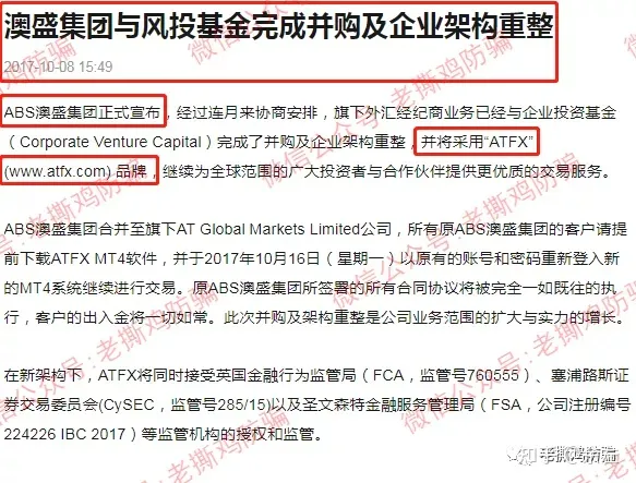 ATFX的前身为ABS澳盛,这是很多老人都知道的(大部分被坑的小白都不知道),这也是ATFX公开承认的(不公开承认也不行,不然澳盛ABS的客户怎么心甘情愿的转到ATFX去?),并且有2017年的新闻为证!!