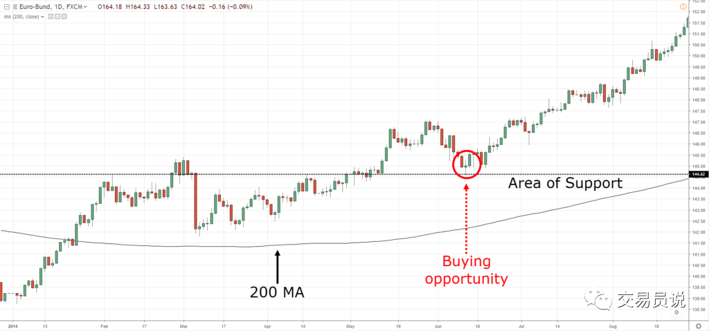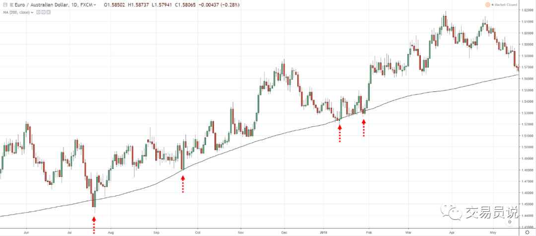 因此,如果价格高于200天移动平均线,你可以在支撑位寻找买入机会。或者,如果价格低于它,你可以在阻力位寻找卖出机会。如下图: