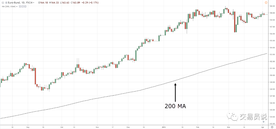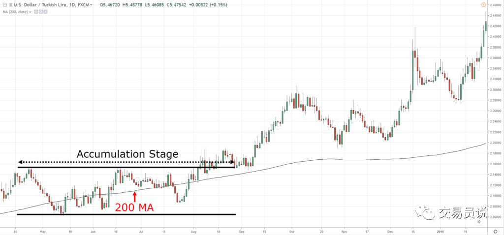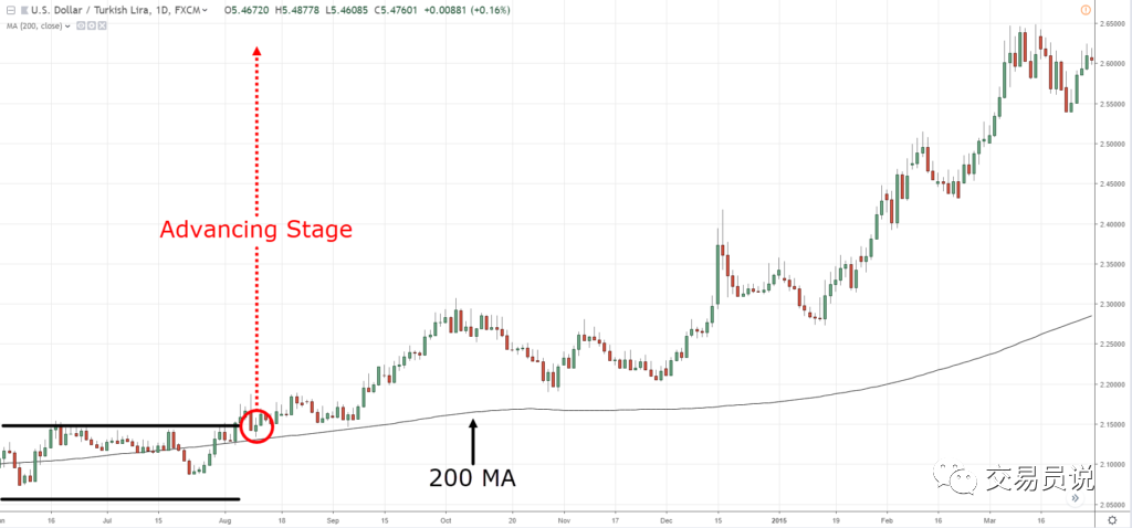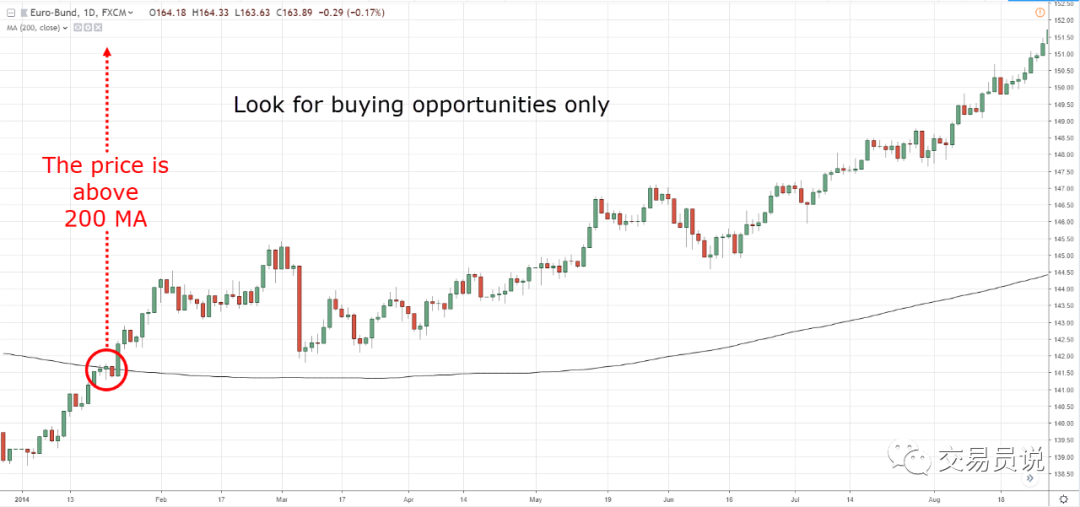 在这个阶段,大多数交易者可以识别趋势并寻找买入机会。此时,你将看到价格高于200日均线并且200日均线开始指向mt4怎么玩教学更高。看下面一个例子: