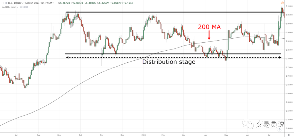 价格疲软的第一个迹象就是在分销阶段(Distribution stage),它看起来像是一个处于上升趋势的区间市场。你会看到200日均线趋于平缓,价格可mt4怎么玩教学能会在其附近“震荡”。这告诉你买卖双方处于平衡状态,市场尚未决定方向。这是一个例子: