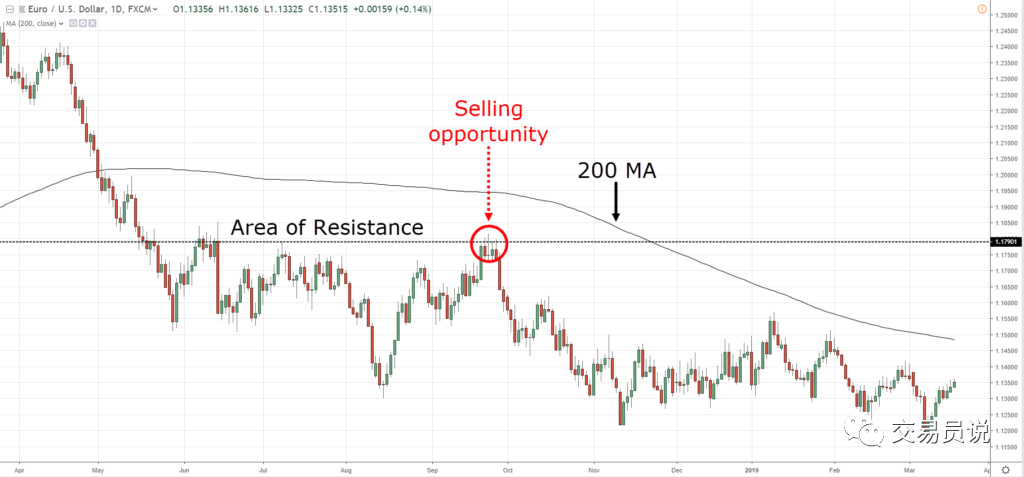 在弱势趋势中,200日均线可以作为一个价值区域。你会注意到价格接近200日均线,然后“反弹”离开——这为进入市场交易提供了机会。如下图例: