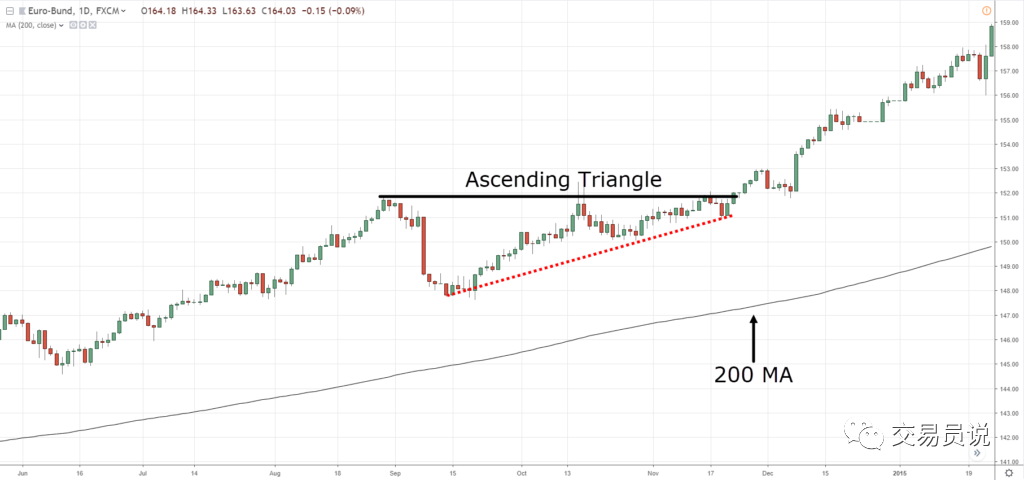 因此,在上升趋势中(价格高于200日均线),你可以寻找上升mt4怎么玩教学三角形并买入突破。在下降趋势中,寻找下降三角形并进行向下交易突破。看下面一个图表例子: